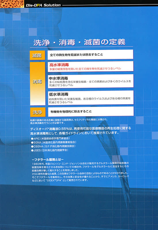 各種ガイドラインで推奨されている高水準消毒薬で、後天性免疫不全ウイルス(AIDS)/HIV-1、B型肝炎ウイルス、C型肝炎ウイルス、ポリオウイルス1型、インフルエンザウイルス香港型、単純ヘルペスウイルス1型、単純ヘルペスウイルス2型、アデノウイルス2型などのウイルスに有効です。